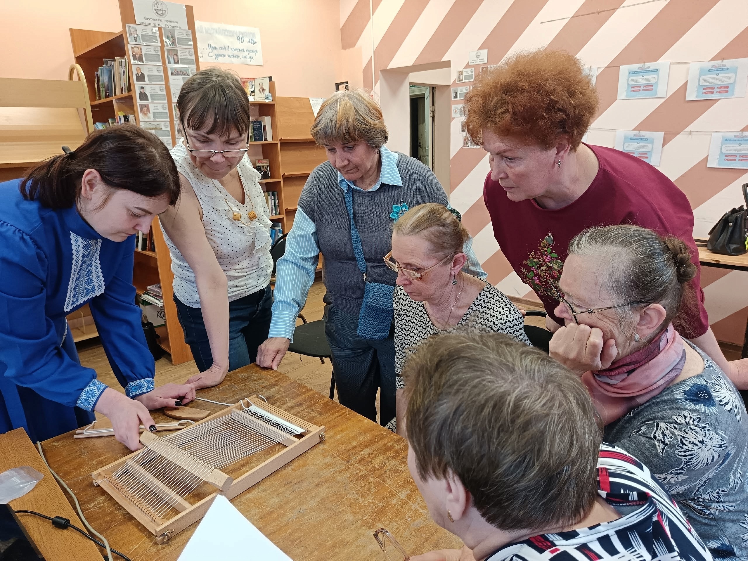 Об истории ткачества и гончарного дела рассказала главный библиотекарь Анна Миненко. Каждый смог попробовать себя в роли ткача: изучили принцип работы настольного ткацкого станка — уменьшенной копии стандартного станка.