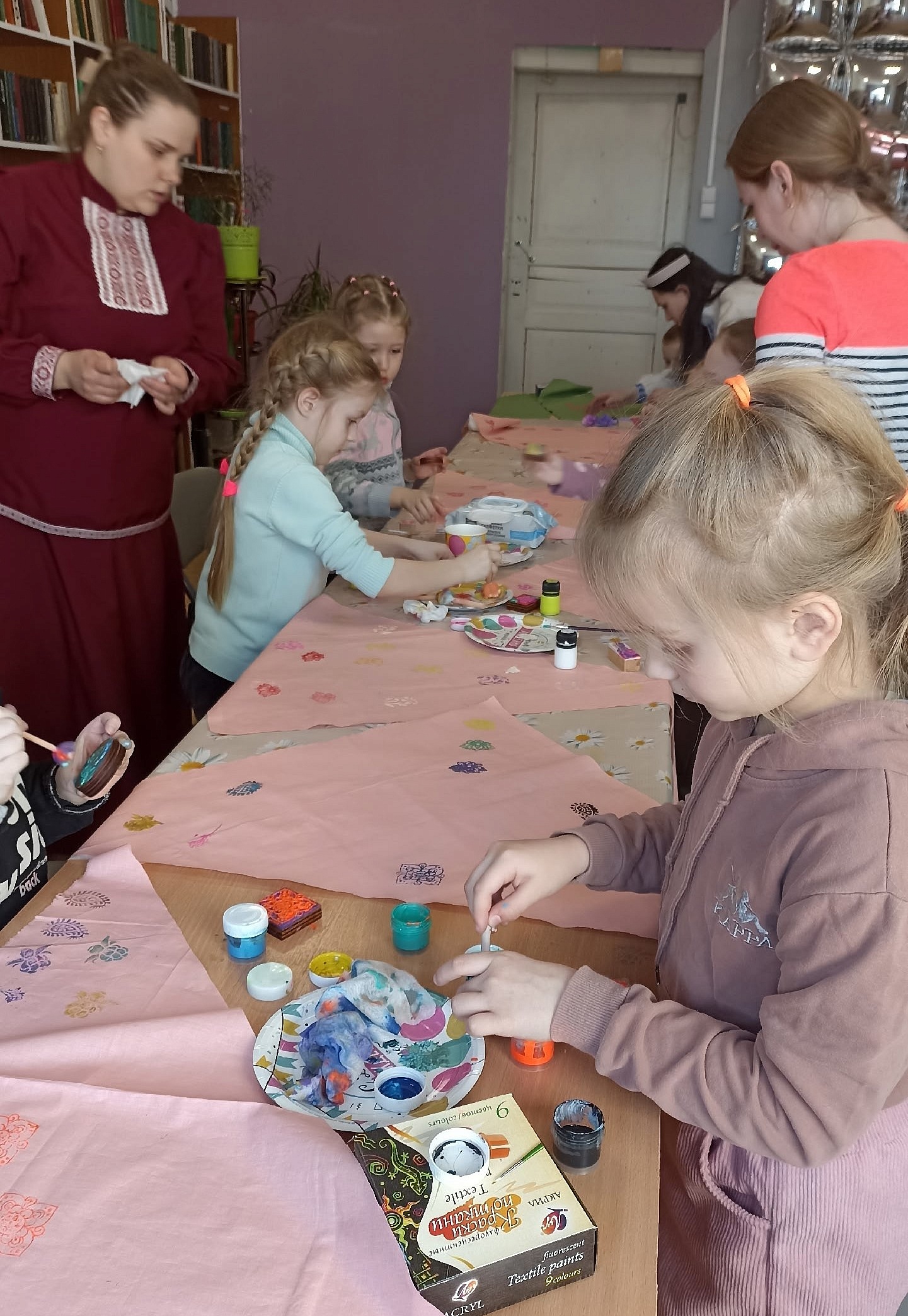 Первыми мероприятиями цикла стали встречи на тему «Промыслы Русского Севера». Они проходят в течение апреля для организованных групп. Каждая встреча сопровождается тематической выставкой, а этнокостюмы библиотекарей создают особую атмосферу. Первых участников встретила старший библиотекарь Емецкой библиотеки им. Н. М. Рубцова Кристина Земцовская, которая провела два мастер-класса «Набойка по ткани» и «Экобрелок из бересты». Участники с удовольствием попробовали себя в роли мастеров. Набойка по ткани оказалась простым и увлекательным процессом. Дети и взрослые изготовили косынки с традиционными русскими орнаментами. А вот изготовление самых обычных элементов из бересты потребовало от участников более точной и сосредоточенной работы.