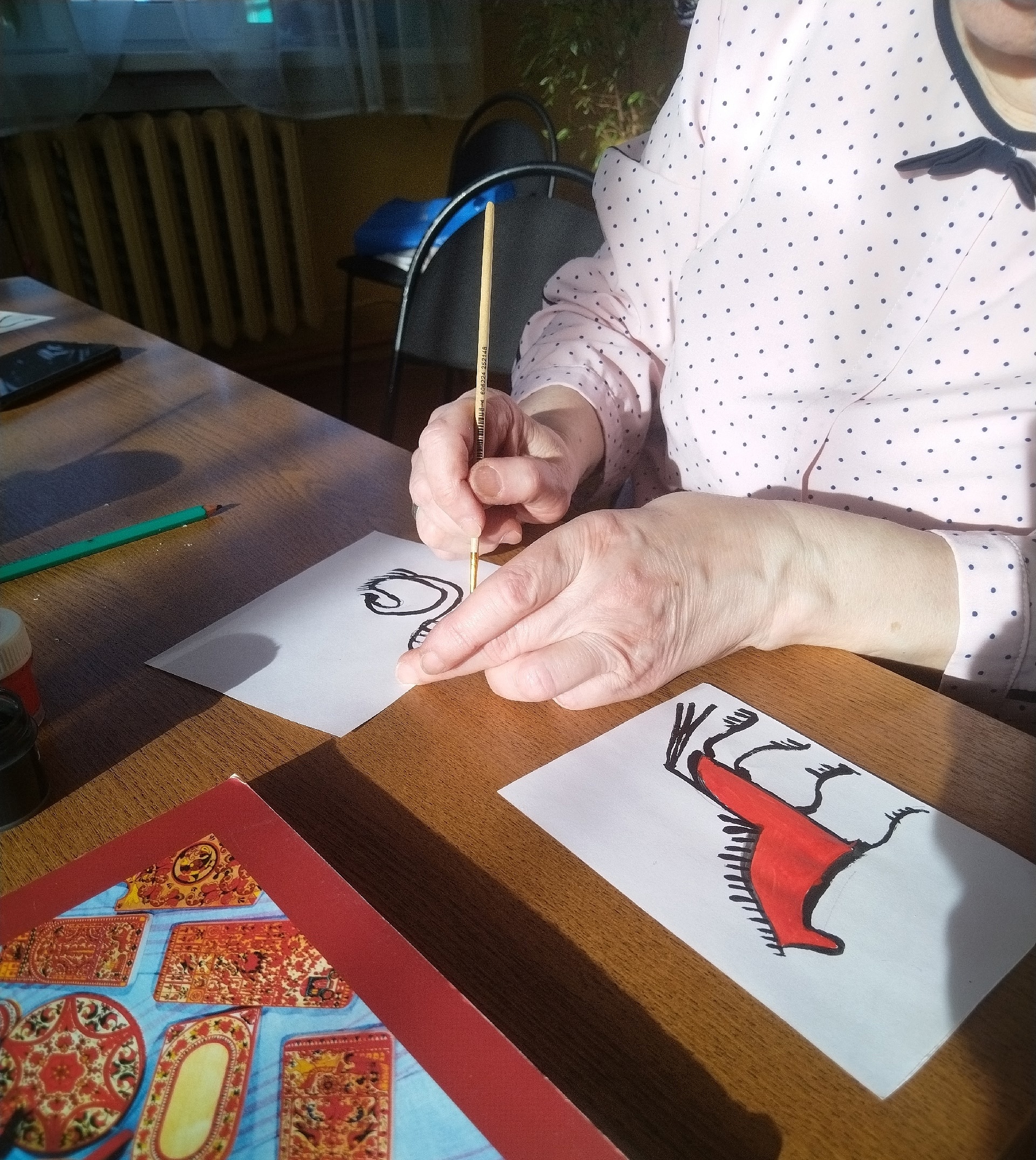 Библиотекарь Емецкой детской библиотеки Виктория Павлова рассказала о росписях Русского Севера. Многие впервые услышали о селецкой росписи, созданной братьями Харловыми из села Сельцо. Сейчас технологии росписи утрачены, но в музее «Малые Корелы» хранится прялка, расписанная мастерами Харловыми. На мастер-классе участники познакомились с элементами мезенской росписи и попробовали нарисовать знаменитого красного коня.