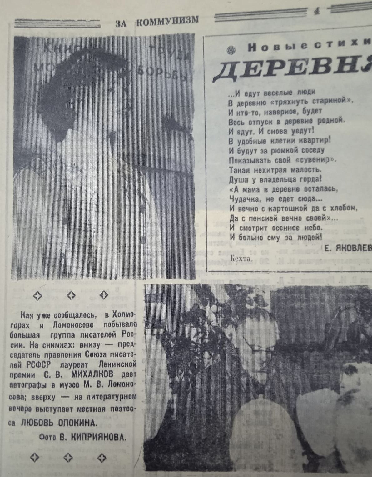 Фотография выступления Любы Опокиной была размещена в одном из октябрьских номеров газеты «За коммунизм» 1970 года. А ещё через 15 лет в той же газете была опубликована фотография Николая Рубцова, читающего свои стихи, опираясь на спинку стула, — как иллюстрация к статье к 50-летию со дня рождения поэта. Эти уникальные кадры остались в истории благодаря фотографу Владимиру Киприянову. Некоторые фотографии хранятся в Холмогорском краеведческом музее.