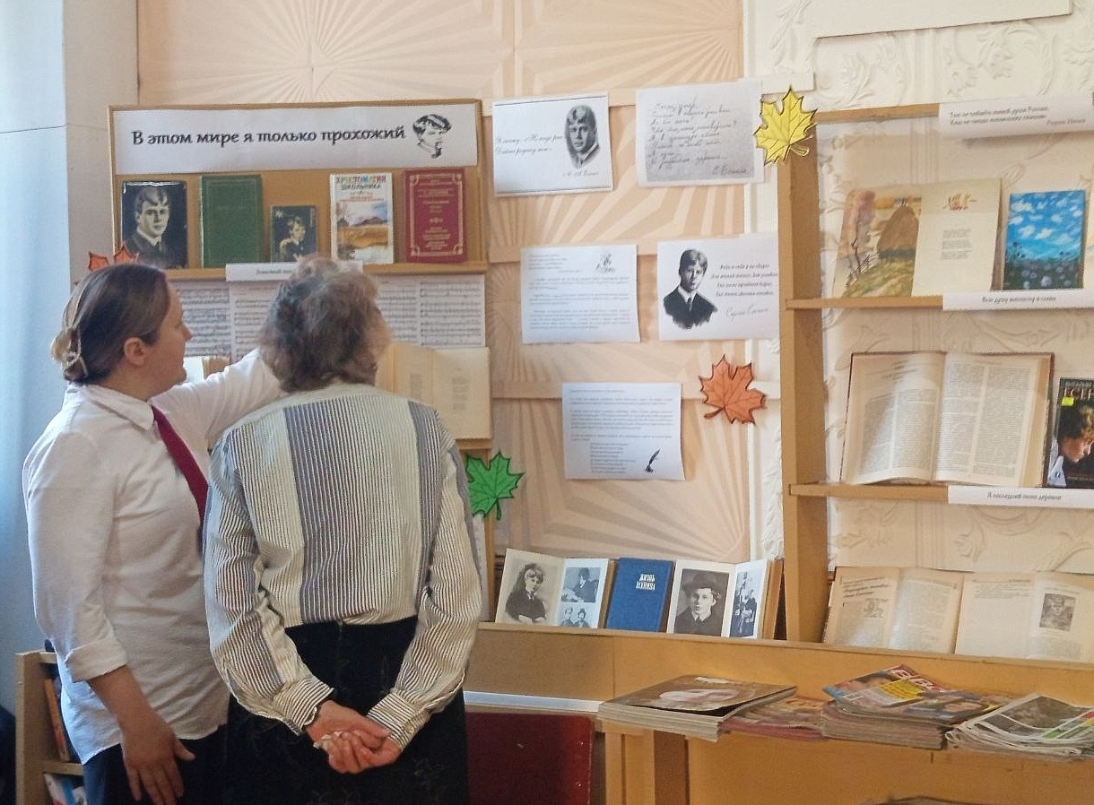 Ко дню рождения поэта в Верхне-Матигорской библиотеке открыта книжно-иллюстративная выставка «В этом мире я только прохожий…», где можно познакомиться с разными изданиями произведений Сергея Есенина, критическими материалами о творчестве и жизни поэта. Библиотекарь провела для читателей обзор, на котором все вместе вспоминали любимые стихи, делились своими мыслями о жизни Есенина, размышляли о тайне его смерти. Кто-то рассказал о поездке на родину поэта, в село Константиново Рязанской области. А еще в этот день в библиотеке звучали песни на стихи Сергея Есенина, слова которых мы все помним наизусть.